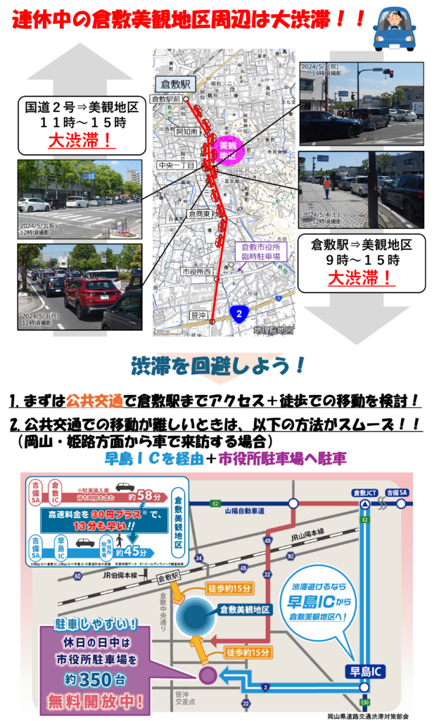 美観地区周辺の駐車場は、連休中は非常に混雑し、日中は入庫に時間がかかることが想定されます。