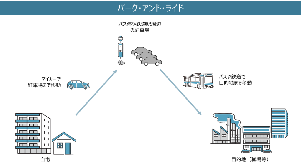 パーク・アンド・ライドとは、自宅からマイカーで郊外の鉄道駅やバス停の周辺に停めて、鉄道やバスに乗り換えて、目的地に向かうというものです。