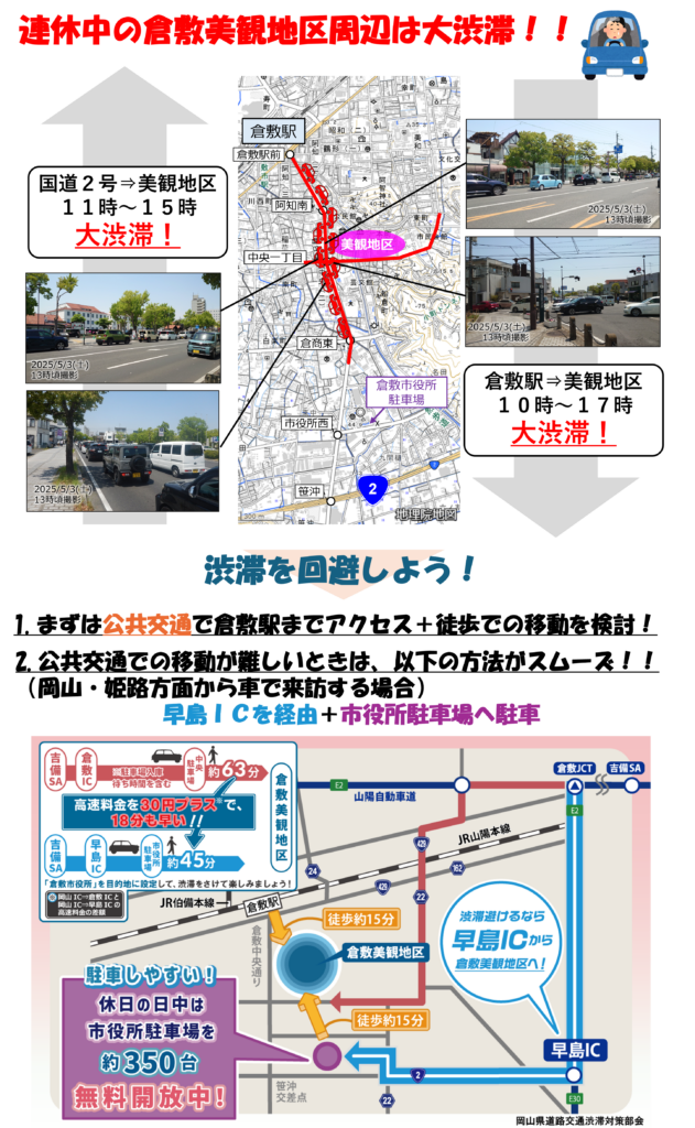 ▶秘訣(2)(岡山・姫路方面から来訪される方向け)車移動の場合、早島ICで降車+市役所駐車場を利用する「スイスイ移動」